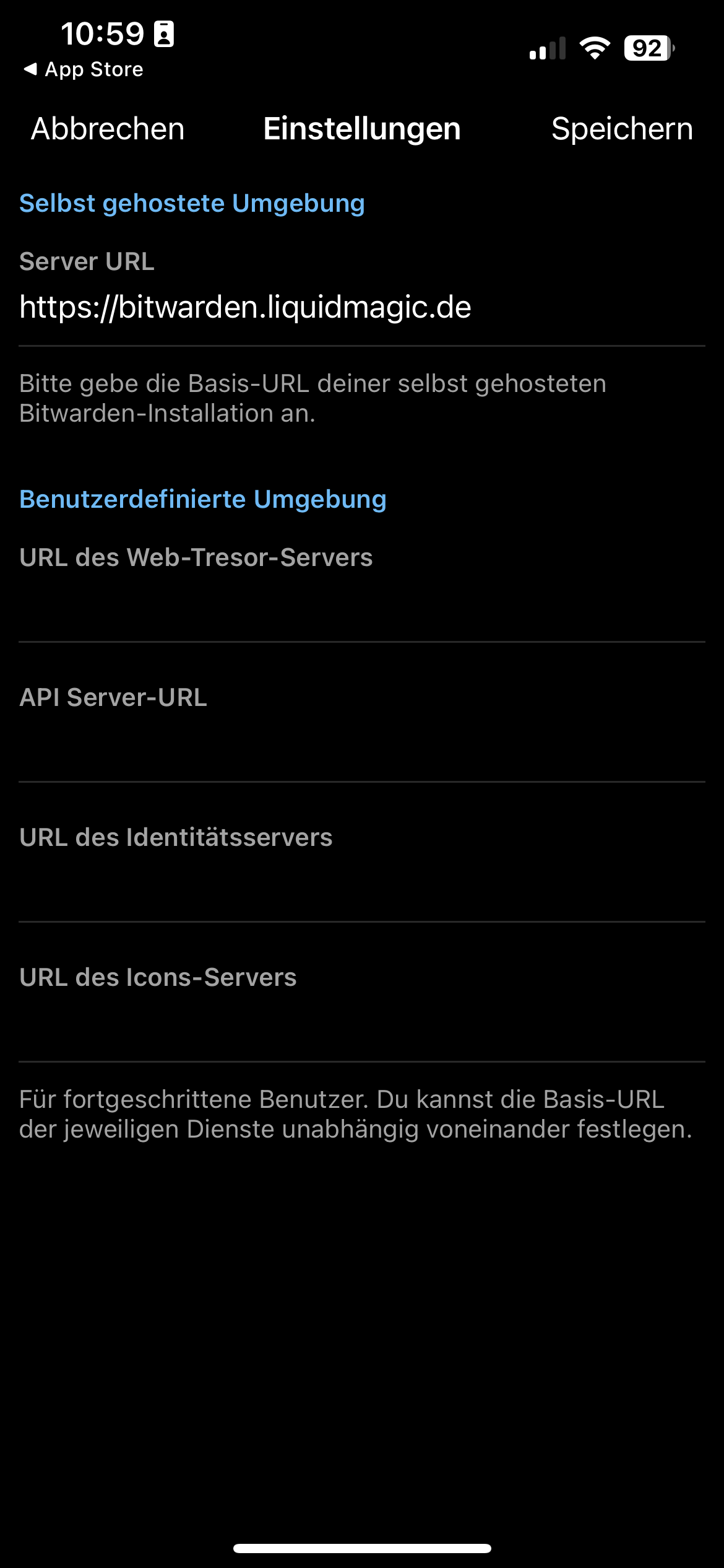 Geben Sie im Feld "Server URL" nun die dargestellte URL "https://bitwarden.liquidmagic.de" ein und speichern sie im Anschluss darauf indem Sie den Button oben rechts auf der Seite betätigen.