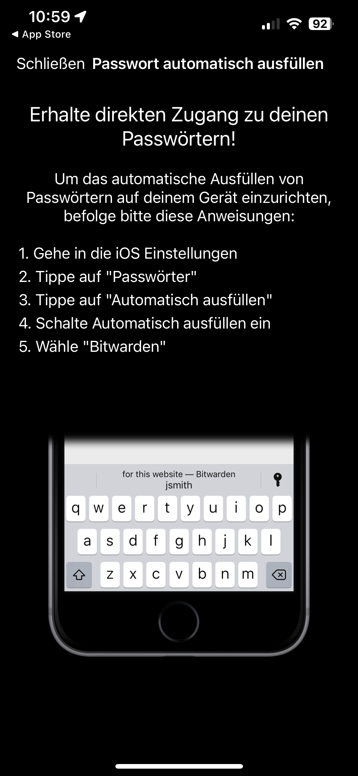 Wenn Sie in der Bitwarden-App auf den Reiter Einstellungen wechseln, finden Sie unter dem Punkt "Passwort automatisch ausfüllen" eine kurze Zusammenfassung der benötigten Schritte zur Einrichtung.